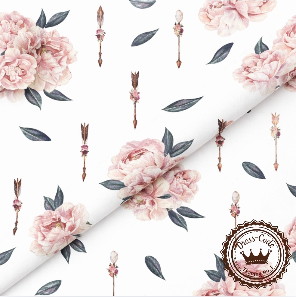 Piwonie i strzały na białym tle- Bawełna Premium
